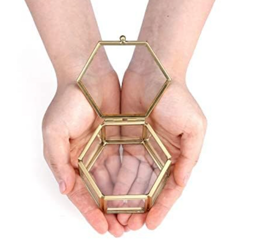 Happishades Vintage Hexagon Glass Jewellery Box with Brass Frame, 2.5 x 2.5 x 1.5 Inch, Decorative Storage Organiser and Holder for Ring, Earrings, Gifting, Ring Platters, Vanity Box, Metal Keepsake.
